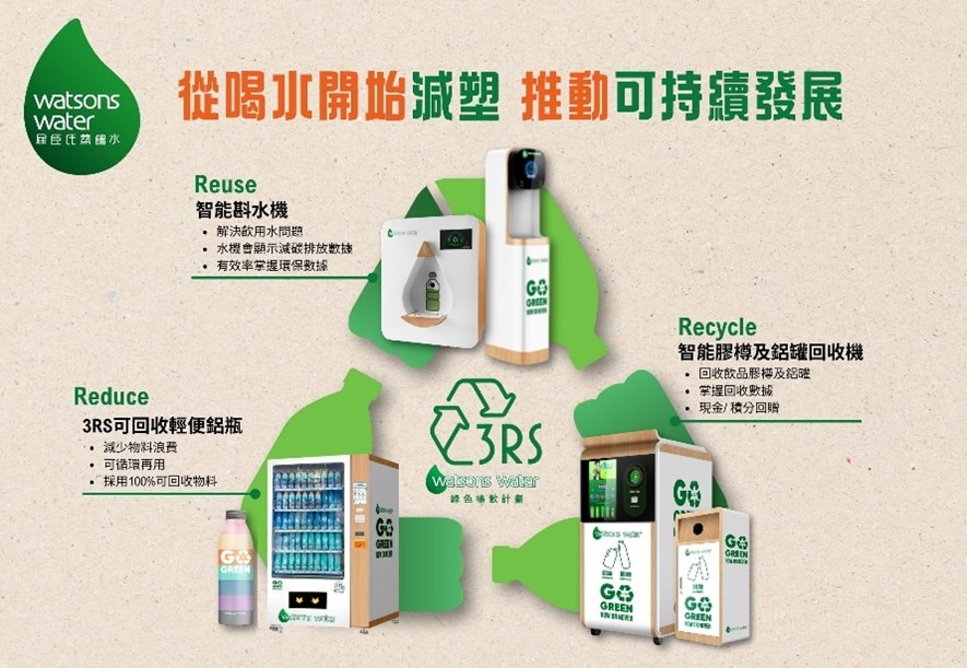 Watsons Water has launched the "3RS Green Alliance" promoting THREE key environmental behaviours: "RECYCLE", "REDUCE" and "REUSE". Watsons Water has a vision to unite corporates and institutions that share the same point of view in protecting our environment and initiating students into sustainable green practices.