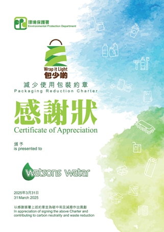 Since 2019, Watsons Water has been the first beverage company in Hong Kong to launch the reverse vending machine (RVM) network. In partnership with various organizations, we encourage the community to participate in recycling, promoting sustainable development. For more details, please refer to the 3RS page.